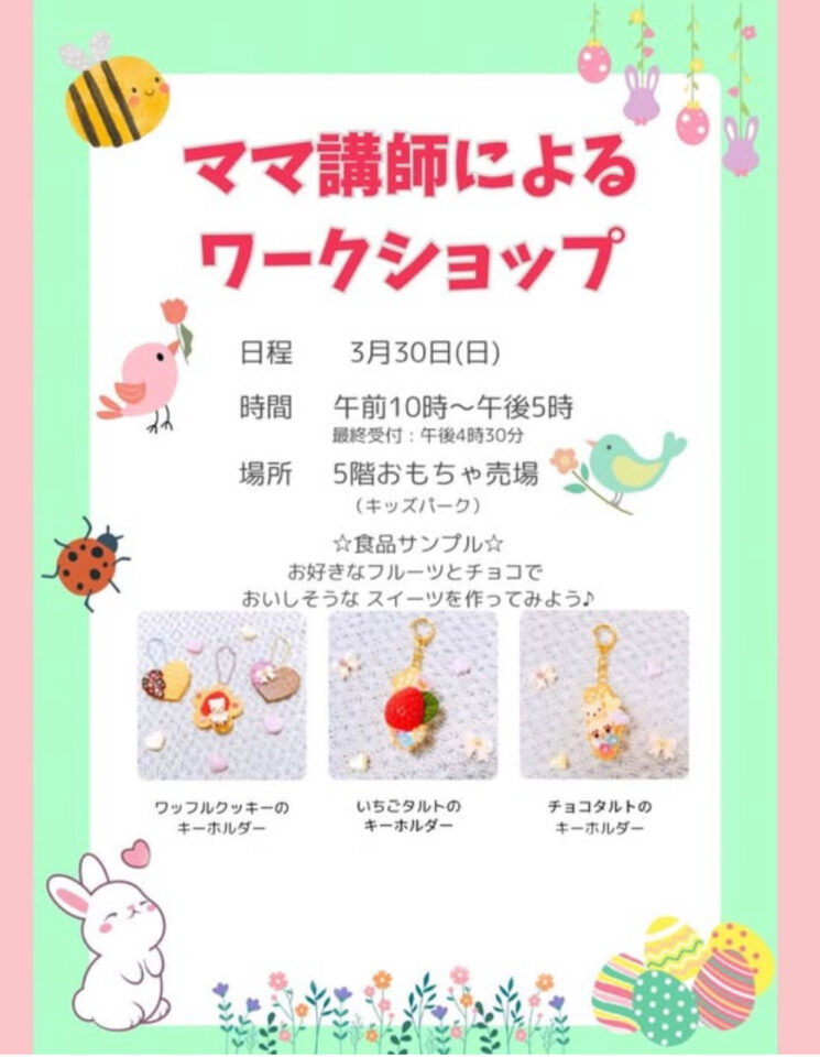 3月30日日曜日、玉川高島屋さまのキッズフロアにてワークショップを開催予定です♪ワッフルやタルトのキーホルダーが作れちゃいます♪是非ご参加下さいね♪